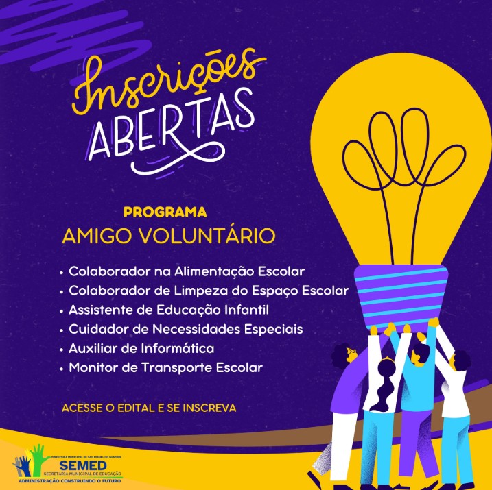 A Secretaria Municipal de Educação (SEMED) convida a comunidade para participar do Programa Amigo Voluntário, que busca fortalecer o apoio às escolas do município através do trabalho voluntário em diversas áreas.